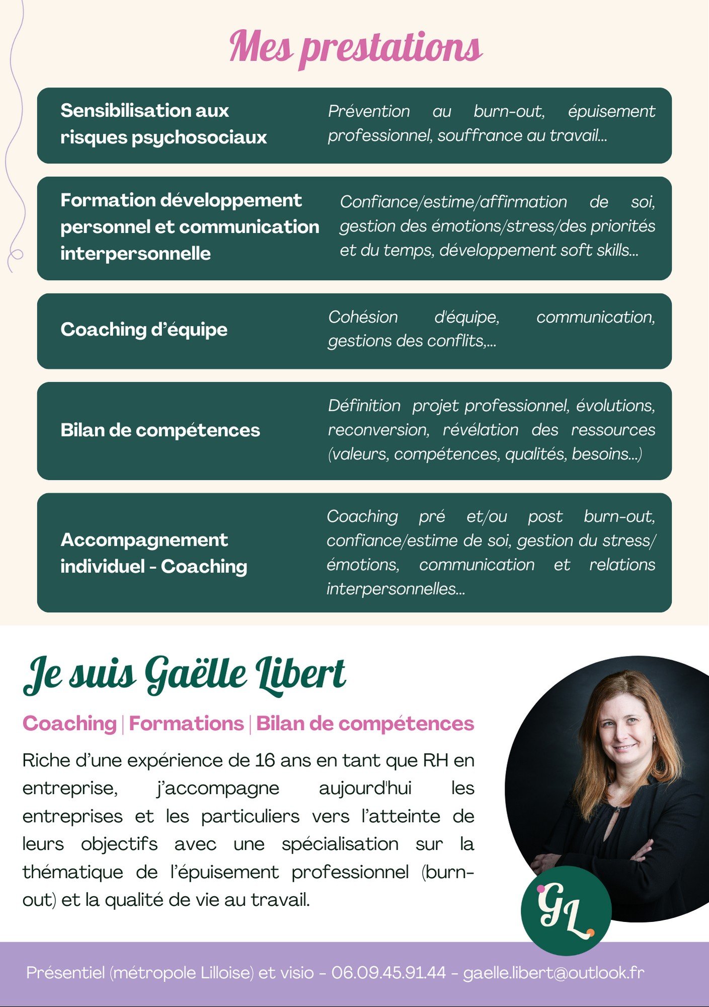 Gaëlle Libert Coaching propose un accompagnement individualisé en bilan de compétences, coaching professionnel et personnel, gestion du stress, affirmation de soi et transition de carrière.Elle intervient auprès de particuliers et d’équipes dans les Hauts‑de‑France, avec une approche humaine et structurée.